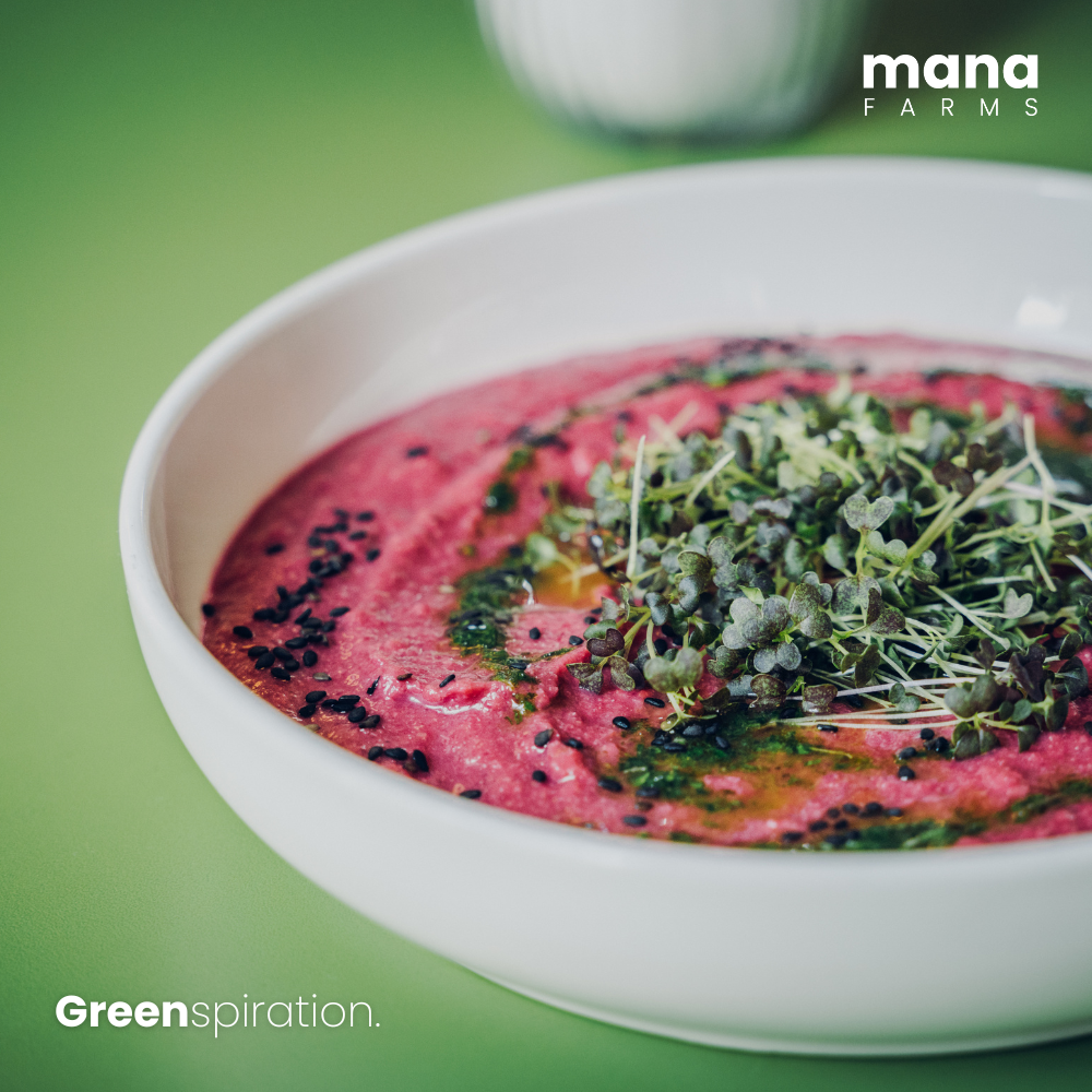 Mizuna Red, eine Senfkohlsorte, rundet den Mix mit einer leichten Schärfe und grünen Blättern ab.