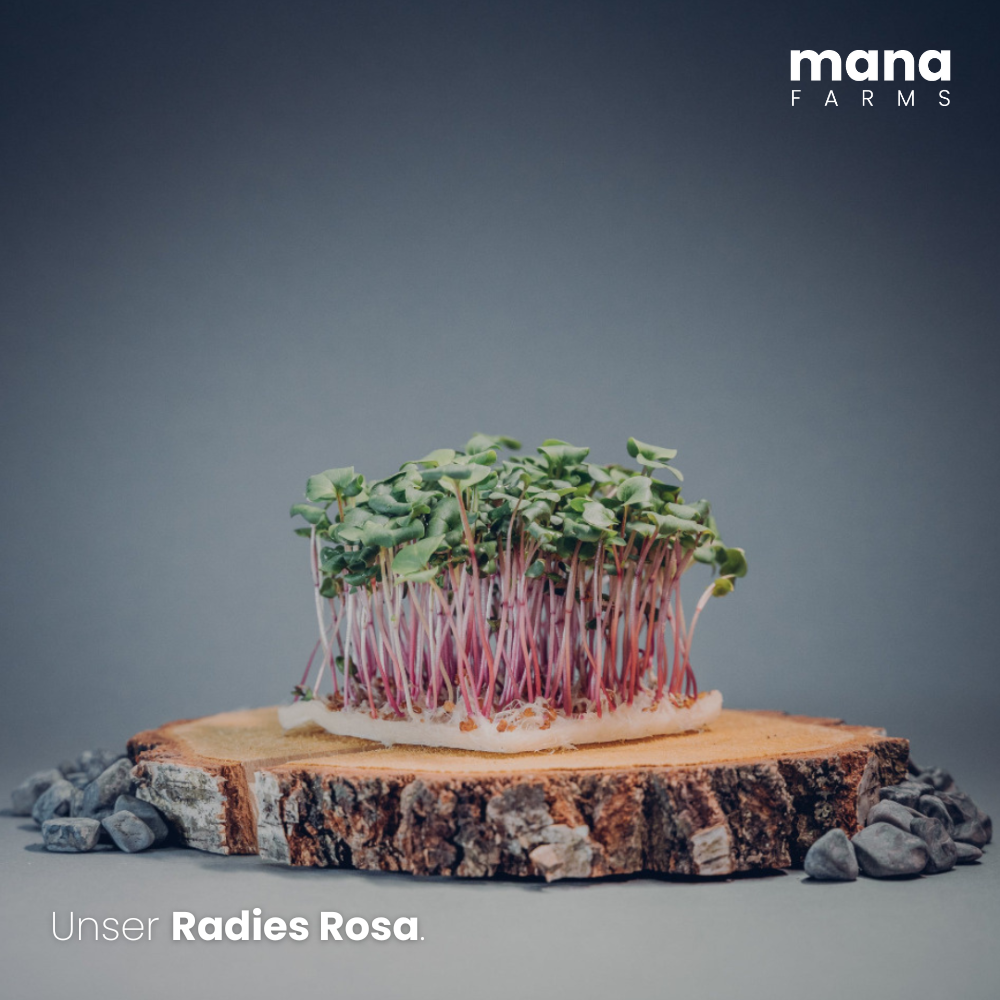 Radies Rosa besticht durch zarte rosa Stängel und ein mildes Radieschen-Aroma.