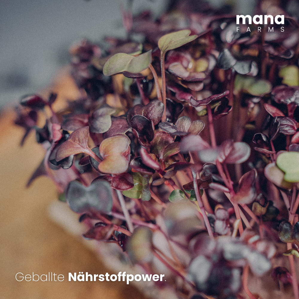 Rad Vulcano besticht durch seine tiefvioletten Blätter, die rosa-violetten Stängel und den intensiven Radieschengeschmack. Es ist reich an Vitaminen, Mineralstoffen und Eiweiß. Im Vergleich zu ausgewachsenen Radieschen enthält es die vierfache Menge an Magnesium. Dank seiner würzigen Schärfe und knackigen Blätter rundet es Salate, Gerichte und Smoothies geschmacklich ab. Nach 9-20 Tagen kann es geerntet werden, am knackigsten ist es nach 8-10 Tagen.